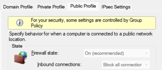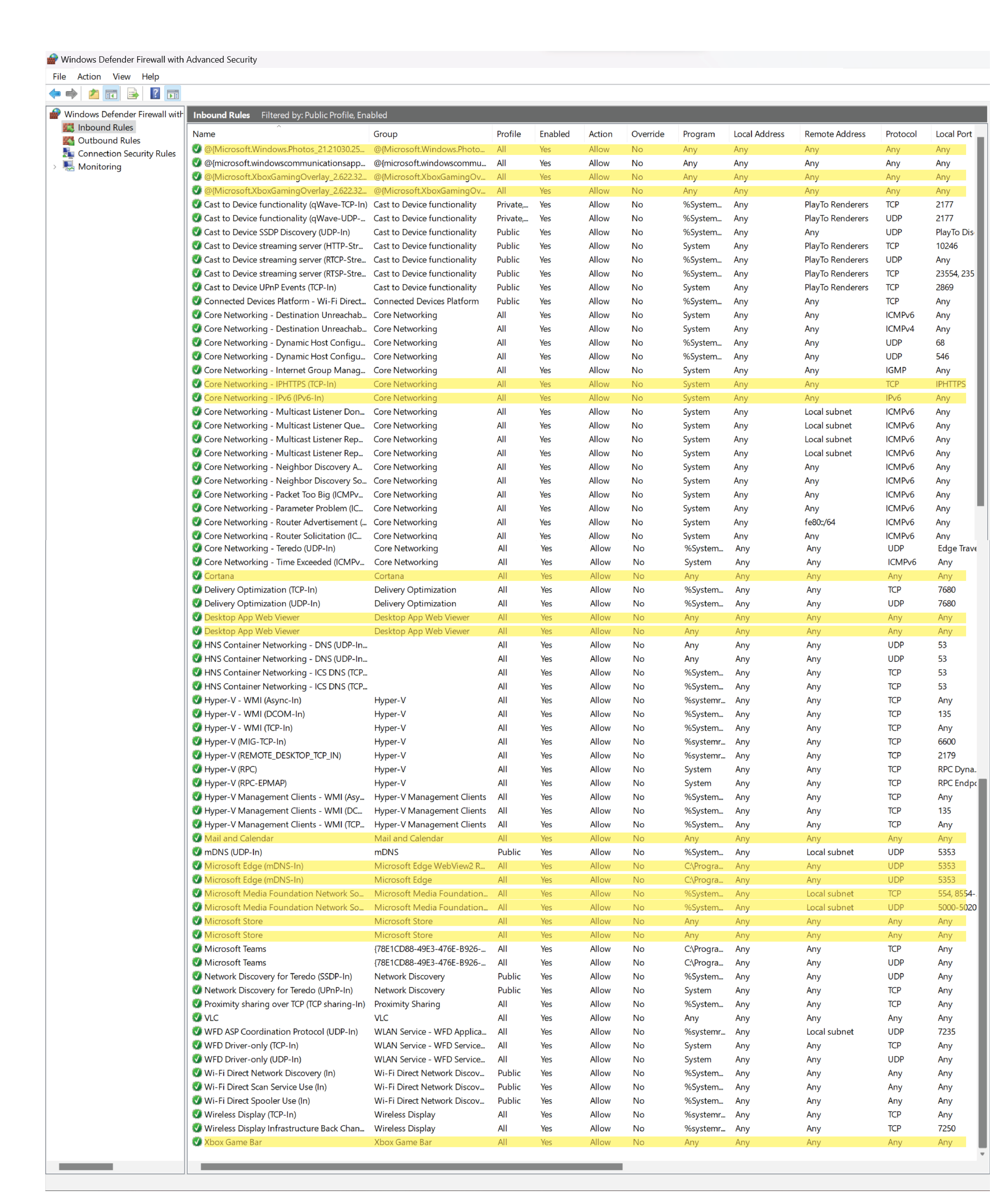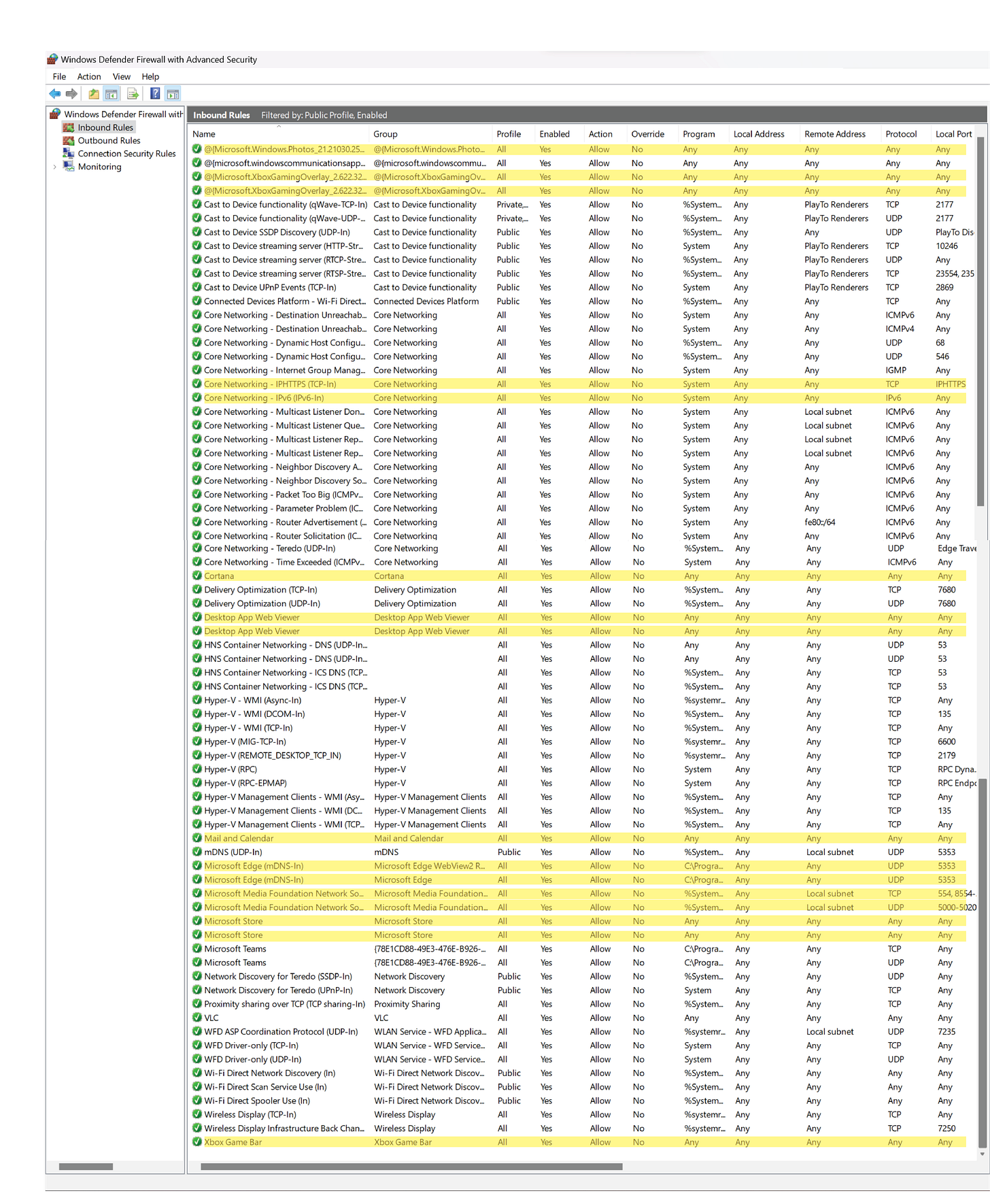 Here's a screen capture of the inbound, allowed, “Public” profile. I've taken the liberty of highlighting the rules that I feel go well beyond "Uhh…" and are truly in the "WTF" category. We'll just skip the point where I don't really care about being able to stream to my laptop from… somewhere on a public network, or that it's unlikely I'll want some rando trying to connect to my Hyper-V configuration. I can see the debate… "Oh, well, those require authentication, and the services aren't even running (usually), and those aren't discoverable (liar), and really, it's okay"… but, no. Security is best implemented in layers, and having a layer just so you can poke holes through it kinda destroys the value of the layer.