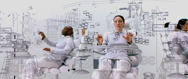 The Matrix Reloaded demonstrated a form of transparency when we descended into Zion. The gate operators were all sitting in front of a virtual, and essentially transparent, interface. While my nerd brain thought this was very cool, I could only imagine how exhausting such an interface might be to actually use. Monochromatic and able to see underlying objects through higher objects… things moving behind things that are static… it just feels exhausting.